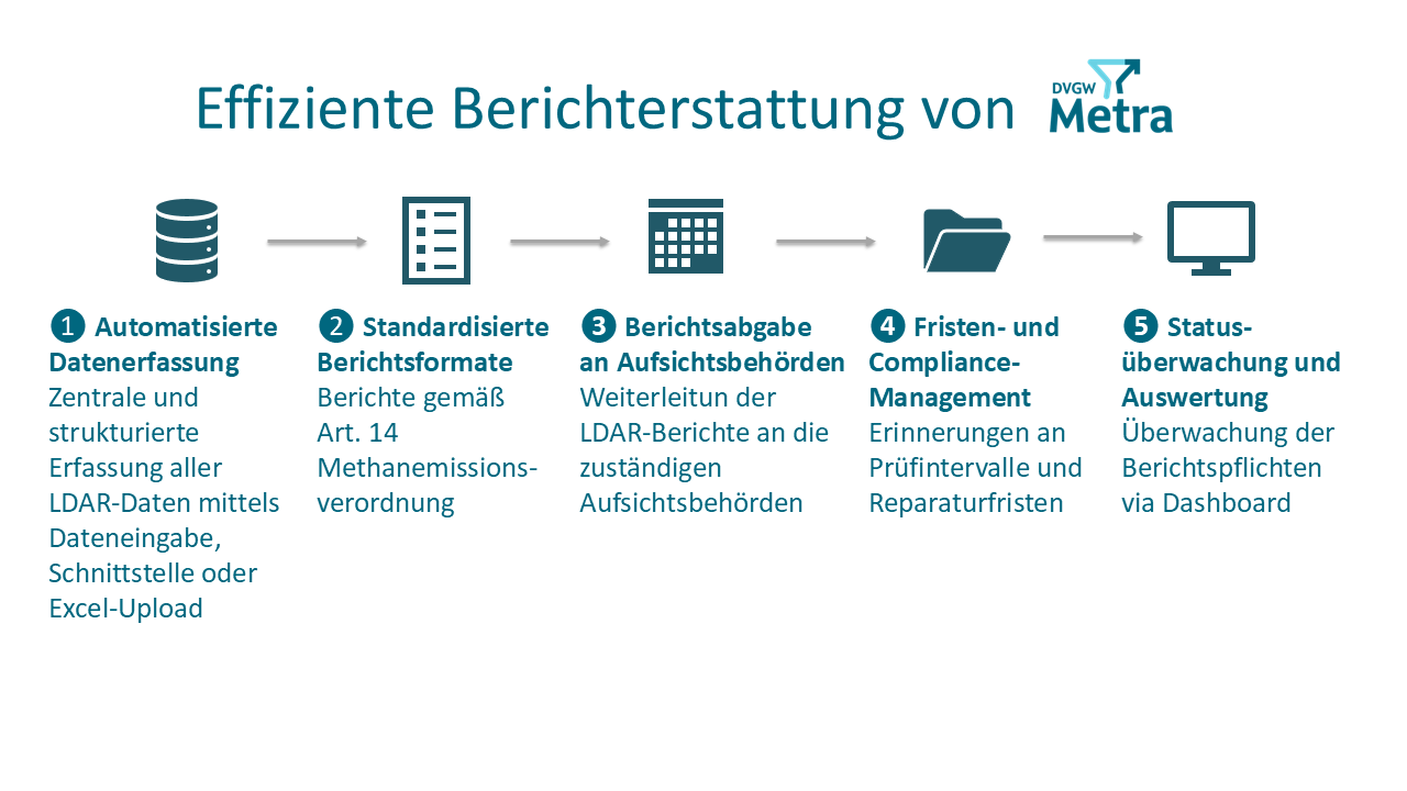 DVGW Metra ist die digitale Plattform der DVGW Service & Consult GmbH. Sie unterstützt Betreiber gastechnischer Anlagen dabei, ihre Berichts- und Dokumentationspflichten gemäß Artikel 14 der Methanemissionsverordnung effizient und rechtskonform zu erfüllen.